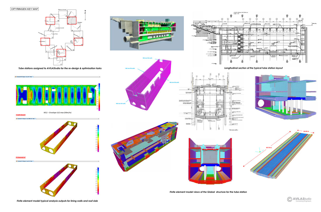 During summer 2017, AVILAStudio was appointed by Andermann Engineering for the execution of a technical assessment for Claim 148&248 and FE analysis of 4 tube stations of the recently inaugurated (in summer 2019) City Ringen project in Copenhagen, in order to determine the impact of retaining walls downgrading to temporary structures. The appointment required the redesign of the tube station underground RC box under the assumption of Temporary Piles conditions and the suitability of retaining walls was assessed considering surveyed conditions, actual mechanical properties and environmental conditions.