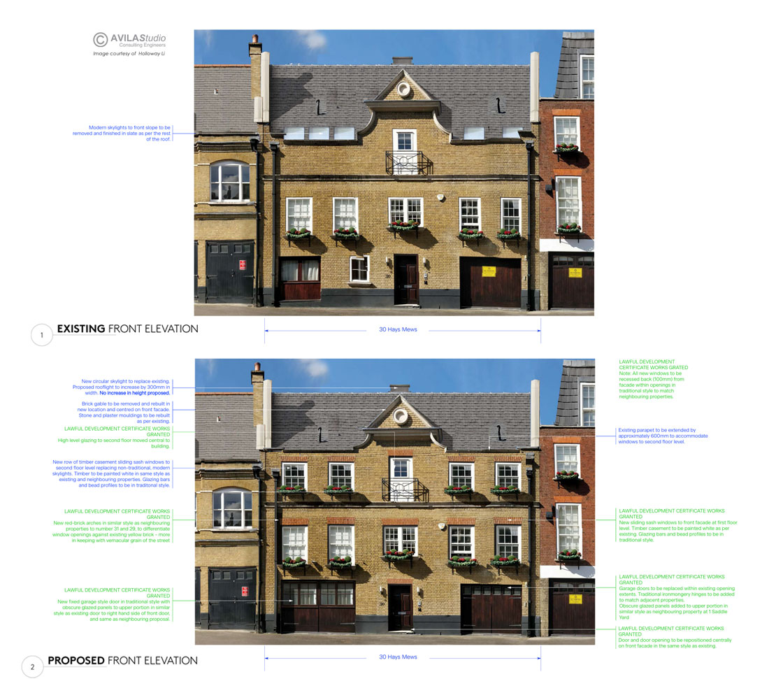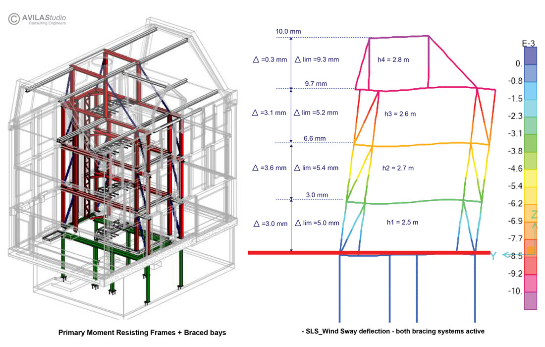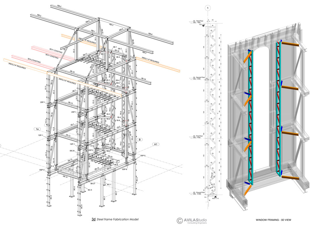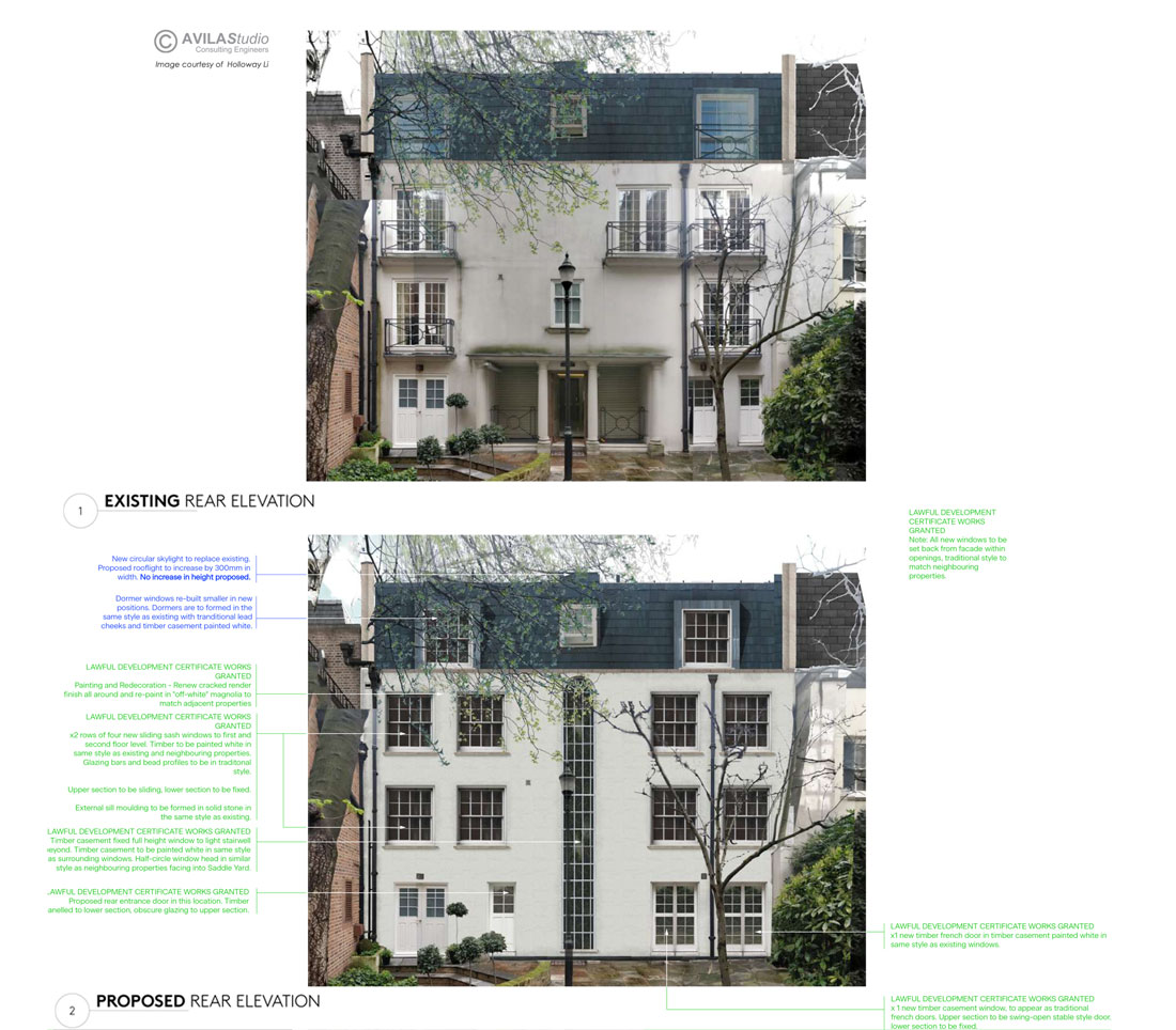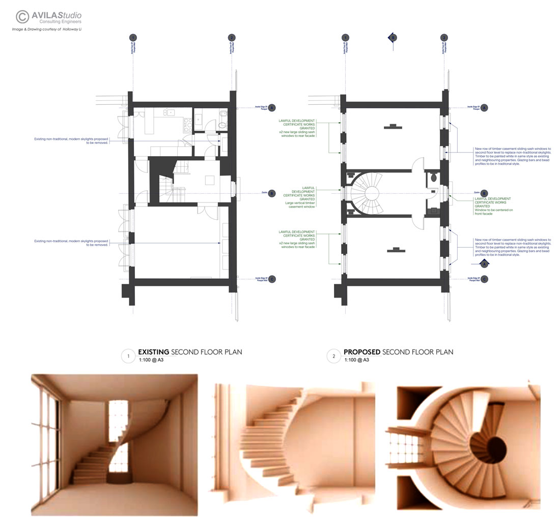In 2017 AVILAStudio was appointed to provide structural engineering services for a Residential Refurbishment project located in the Mayfair area. The project required a reconfiguration of the internal spaces and of the front and rear façade openings to suit the current requirements of the client. The building had been reconstructed during the works carried out in 2010-2011 and featured a masonry lad bearing structure with flat slab concrete floors for the first 3 levels and a traditional timber joist and steel frame floor for the roof level. The main challenge of the project was to agree on a strategy to partially demolish the concrete floors for the insertion of a post-tensioned sone stair, helicoidal in shape, centrally located with respect to the building floor plan. The main reason behind the floor plan rearrangement was to achieve a better use of the space and the creation of a central “natural light channel.