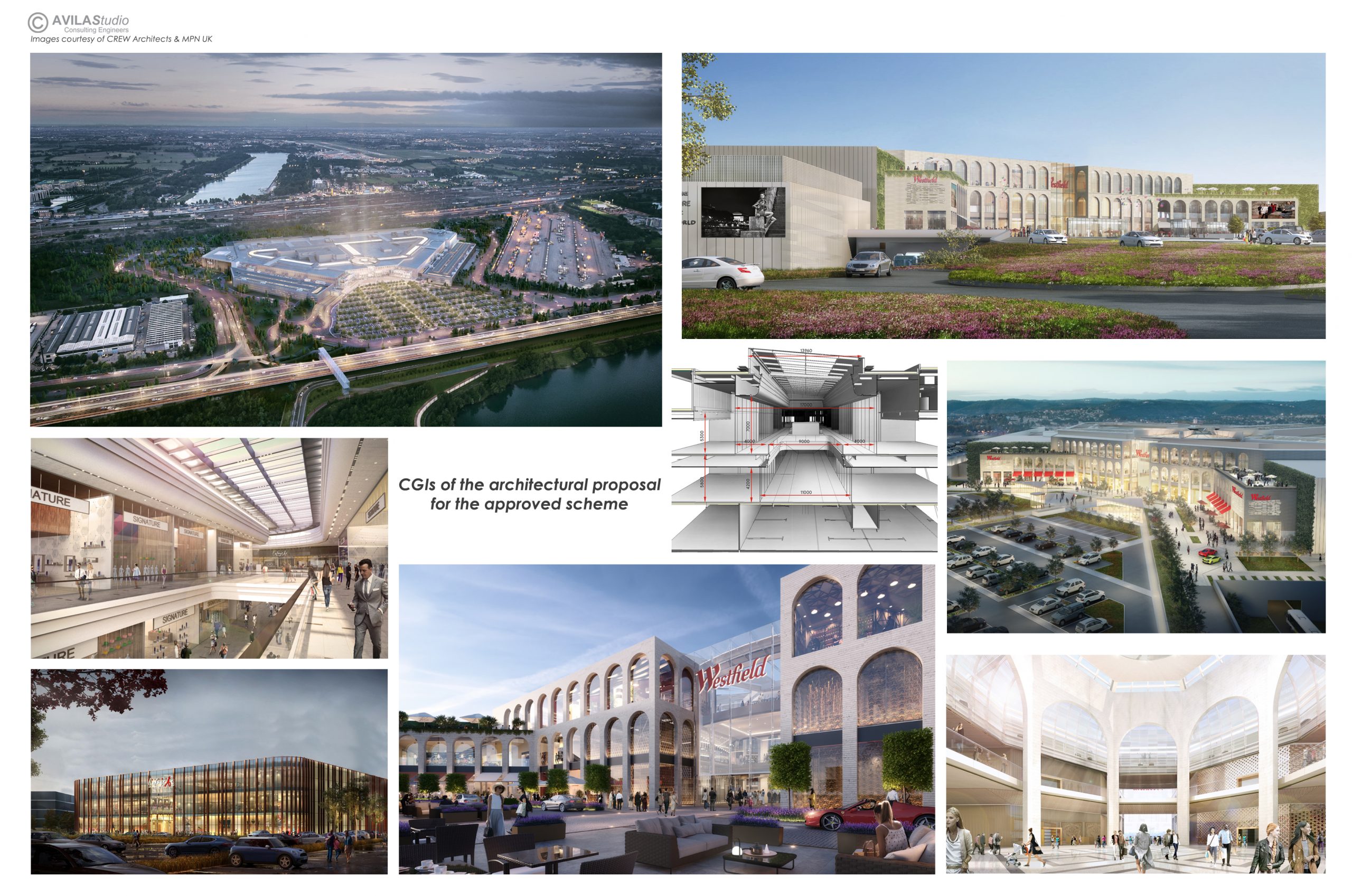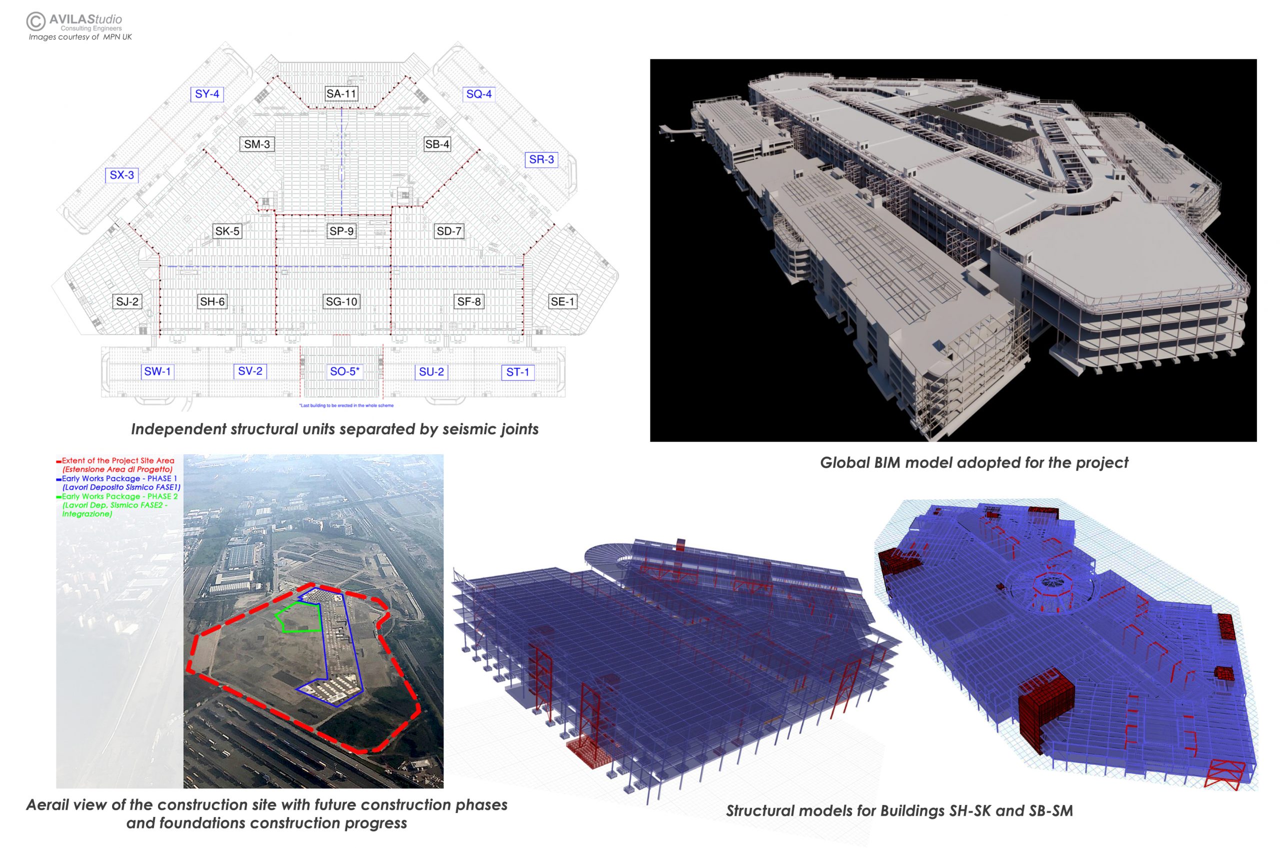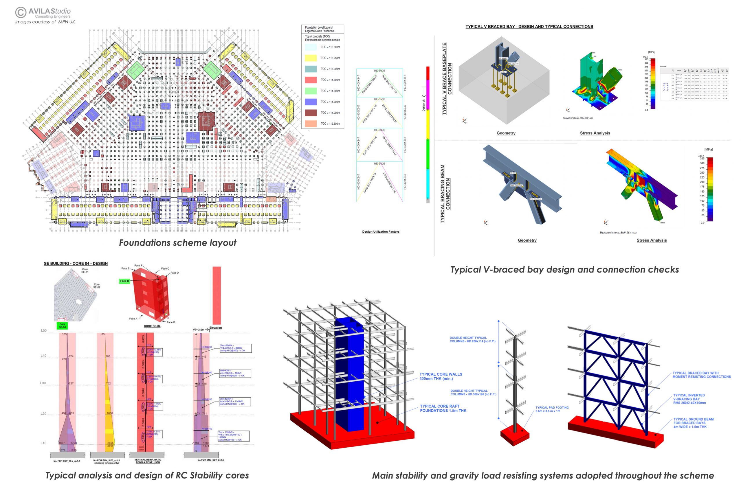 While acting as team leader for MPNUK, we were involved in Stage 2, Stage 3 and Stage 4 design of the Westfield Milan commercial centre, one of the biggest shopping mall in Europe. With its 422,000 sqm of built surface, the commercial centre project involved the analysis, design and detailing of 16 composite steel-concrete and precast structures located in the proximity of the Linate Airport within a plot area of nearly 60 acres. The project site is characterized as a mild seismic area (zone 3) and all structural units were designed as Class 3 independent structures through to the adoption of seismic isolation joints (sliding joints with limited force transfer interaction). The main stability systems are composed by RC cores on raft foundations, Moment Resisting Frames with pinned bases and Inverted V-brace Frames on both pad footing and foundation beams, whilst the gravity load-bearing system is composed of traditional steel columns for the shopping mall and precast RC structure for the parking buildings. The original site was an ex-industrial area and the geotechnical conditions required the foundation levels to be located at different depths depending on the achievable soil strengthening strategy. A significant number of transfer structures were also required to comply with the proposed commercial and leisure layout, with particular reference to the 16 UCI cinema boxes located on the roof of the commercial centre. The main entrance of the commercial centre also hosts the so-called ‘Luxury Village’ area which is characterized by a 20 m diameter glazed roof, the Occulus, supported by radial trusses supported on the main shopping mall structures on the outer edge and, on the inner edge, partly cantilevering off an octagonal steel structure located towards the centre of the Occulus area which identifies the main central plaza. Aside from the shopping mall buildings the centre also comprises of 5 independent parking structures connected to the main building via linking bridges. These auxiliary structures are designed with a precast framing system with in-situ RC stability cores. The project, currently under construction, is due for completion in 2022/2023. To date, the whole set of foundation structures for all southern buildings have been completed.